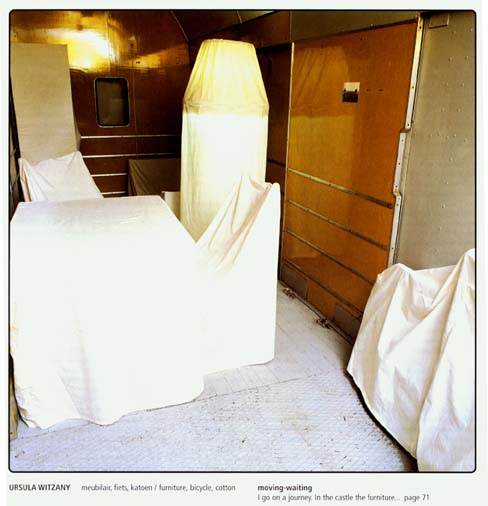 -------------------------------------------------------------------------------- I go on a journey. In the castle the furniture is set in a state of waiting. It disappears under white covers. Light and dust cannot cause it anymore. Table, chair, bed and cupboard keep their place, they expect my return.